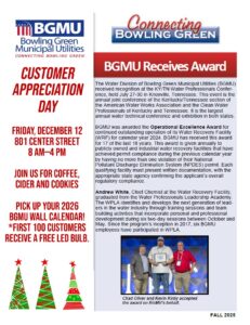 In BGMU’s service territory, there are four water pressure zones that are regulated by five system water tanks. There are 5,720 manholes, 6,736 system valves, and 59 sewer pump stations throughout our system. The largest water pipe size in our system is 60 inches, and the largest wastewater pipe size is 48 inches.